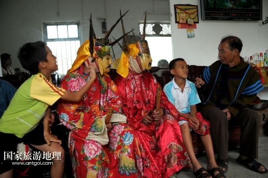 國(guó)家旅游地理 廣西河池8月19日訊 8月18日,譚圣慈老人(左一)帶著前來(lái)學(xué)習(xí)的兩名男孩跳儺面舞。在廣西北部與貴州交界一帶的我國(guó)唯一的毛南族自治縣——環(huán)江毛南族自治縣,神秘的儺戲被譽(yù)為毛南族的“族寶”。原始古樸、風(fēng)格獨(dú)特的儺戲是毛南族的民間傳統(tǒng)舞蹈,藝人在表演過程中經(jīng)常戴著被稱為儺面的木制面具。儺面一般高30厘米、寬20厘米,由毛南族藝人在民族口頭文學(xué)的基礎(chǔ)上依據(jù)個(gè)人想象創(chuàng)作,用優(yōu)質(zhì)木塊雕琢而成,共有文、武、善、兇四大類72種面相。
