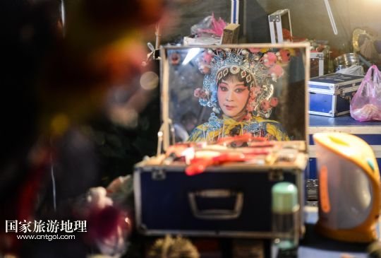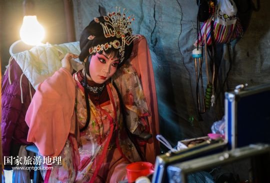 1月3日,武義壺山婺劇團的演員在上臺前整理頭飾。