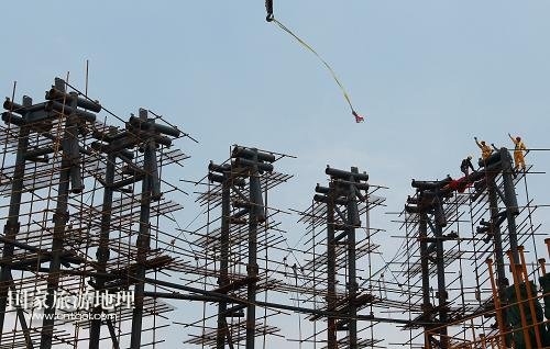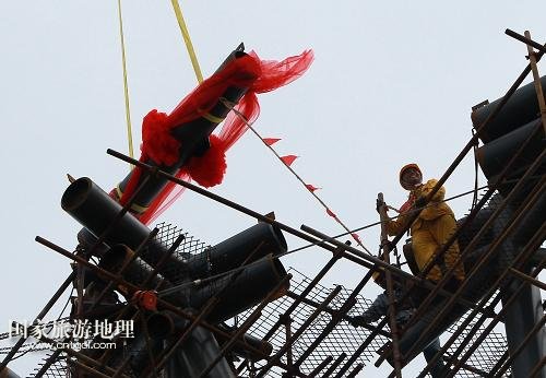 國家旅游地理 上海8月3日訊 8月3日,上海機械施工集團公司的工程人員指揮最后一榀桁架的吊裝。當日上午,隨著塔冠結(jié)構(gòu)中最后一榀鰭狀桁架緩緩起吊并安裝到位,歷時近6年建設(shè)的“上海中心”按計劃順利達到設(shè)計高度632米,刷新了“申城之巔”的新紀錄。據(jù)介紹,“上海中心”2014年年底將實現(xiàn)除酒店精裝修部分外的土建竣工,2015年年中將投入運營。新華社記者 裴鑫 攝