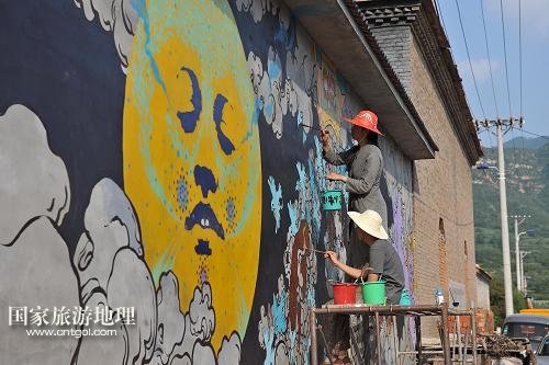 8月10日,兩名藝術(shù)家在山西省和順縣許村的墻壁上繪畫(huà)創(chuàng)作。近年來(lái),許村發(fā)展旅游業(yè),三次舉辦鄉(xiāng)村藝術(shù)節(jié)并邀請(qǐng)國(guó)內(nèi)外藝術(shù)家參加創(chuàng)作,讓現(xiàn)代藝術(shù)和鄉(xiāng)村文明相互融合。