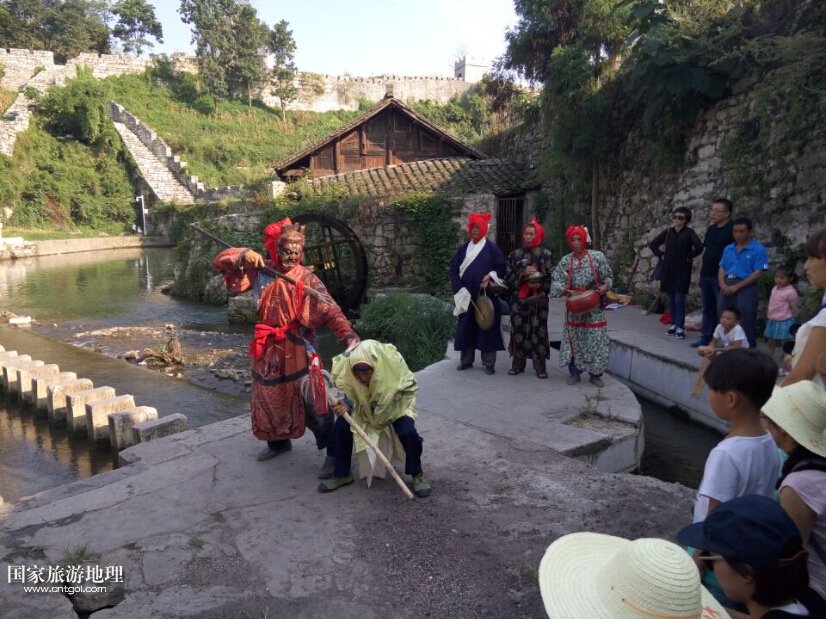 這是福泉民間老藝人在表演福泉陽戲《二郎鎖孽龍》。福泉陽戲,所謂陽戲是指唱給活著的人聽的;也有陰戲,便是唱給死去的人聽的。陽戲主要有兩種功能,一種是娛樂,另一種便是還愿納吉,意思是之前向天神祈求的事情實現(xiàn)了,于是便唱起陽戲向天神還愿,同時也向天神祈求吉祥。福泉老藝人在表演陽戲的時候,雖然言語不通,但依然可以感受到陽戲所具有的獨(dú)特魅力,以及陽戲中所蘊(yùn)含的民俗文化。